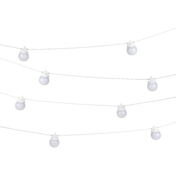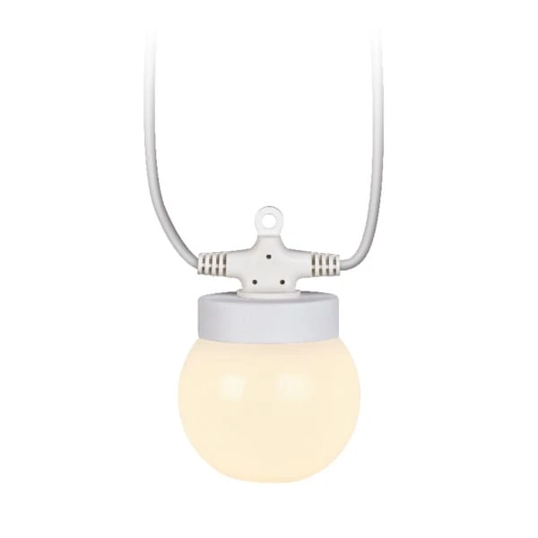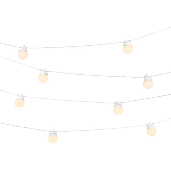 Iluminación de exterior en forma de guirnalda con 10 bolas para decorar tu jardín o terraza. Tiene una longitud de 12 metros. Es resistente a la lluvia por su grado de protección IP44. La luz LED es integrada y ofrece un color de luz blanco cálido.