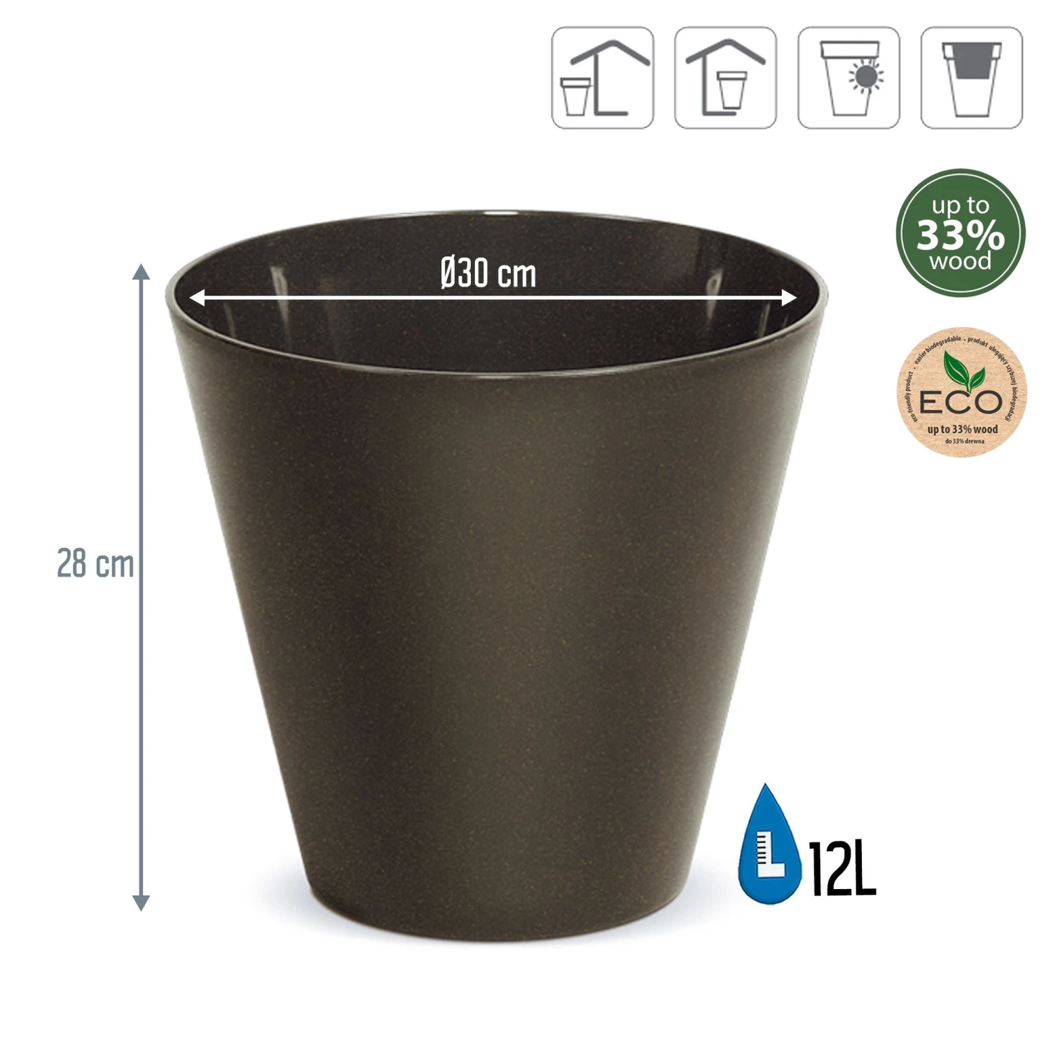 Este macetero, como ves en la imagen, tiene un atractivo color y diseño; se trata de un macetero en color café, y con unas dimensiones de 30x30x28cm, con capacidad para 12 litros
