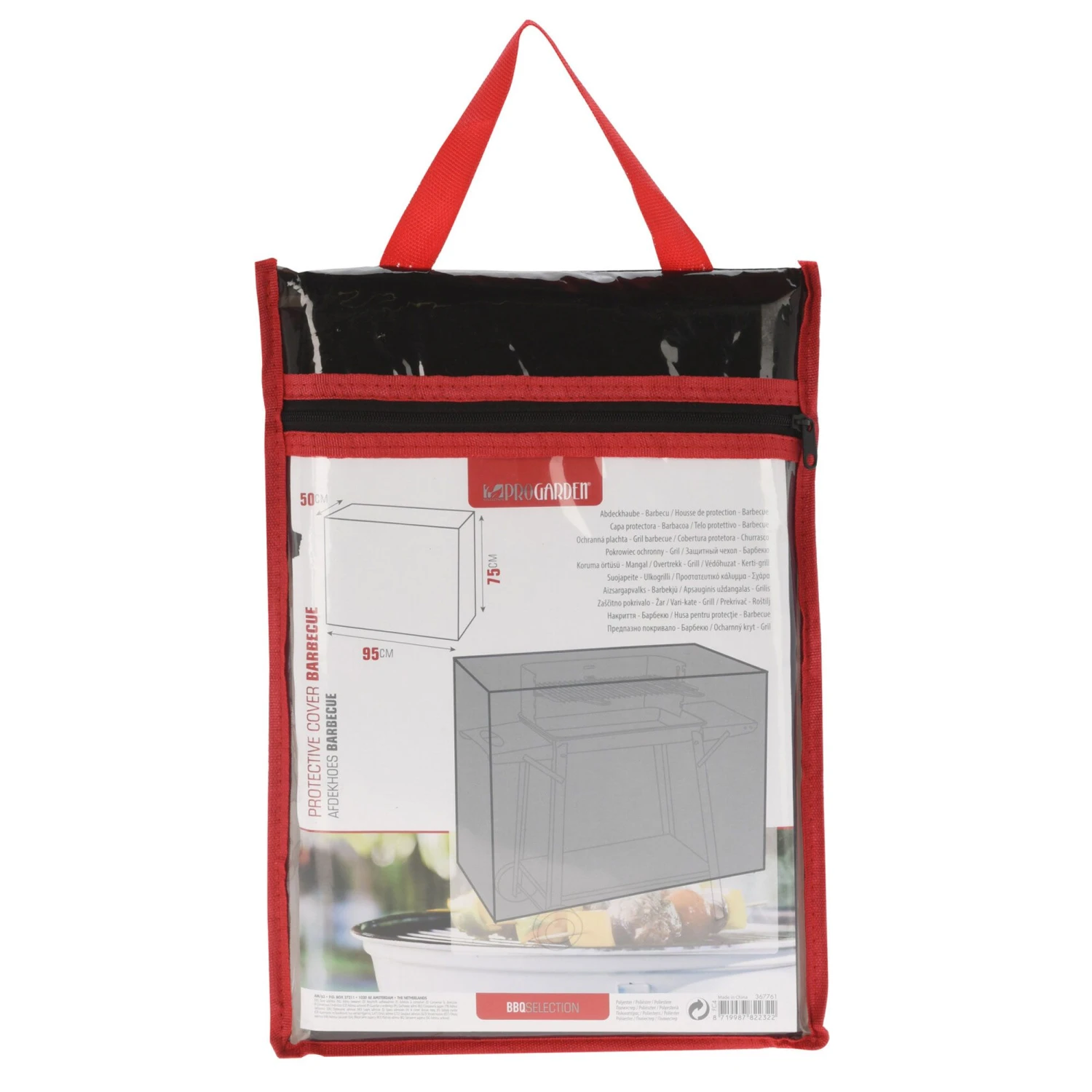 Funda para barbacoa, rectangular, tamaño 95x50xh75cm, peva, en color negro con tubo rojo, embalada en bolsa de transporte de peva con cremallera con banda roja y cremallera negra, con nuestro diseño etiqueta color / bolsa de transporte, 245x20x340mm, estuche con insertox: 950mmx
